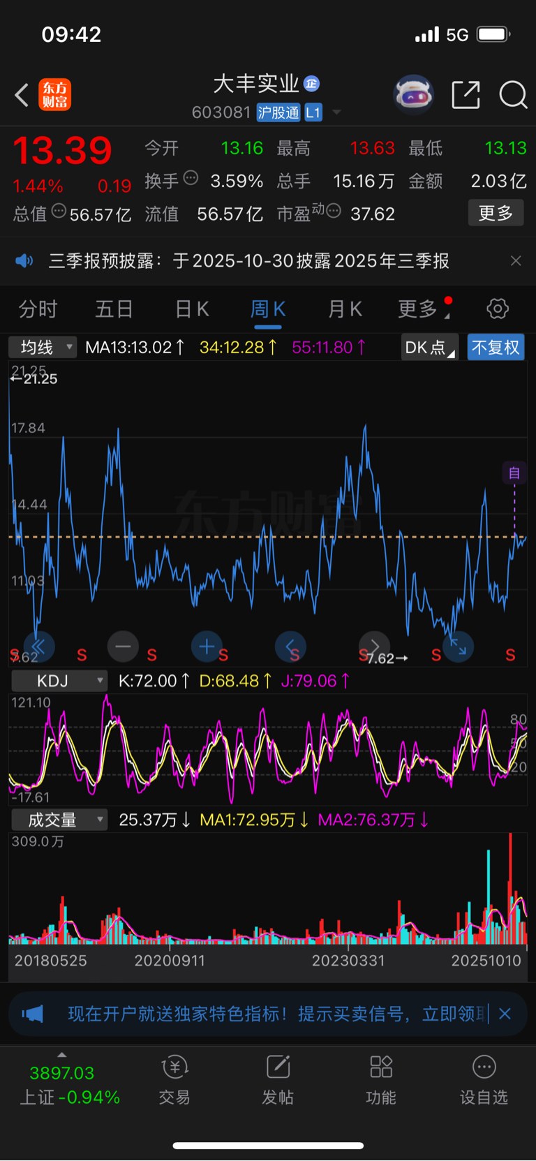 $大丰实业(SH603081)$ 九年了,您觉得它有大幅拉升过吗?