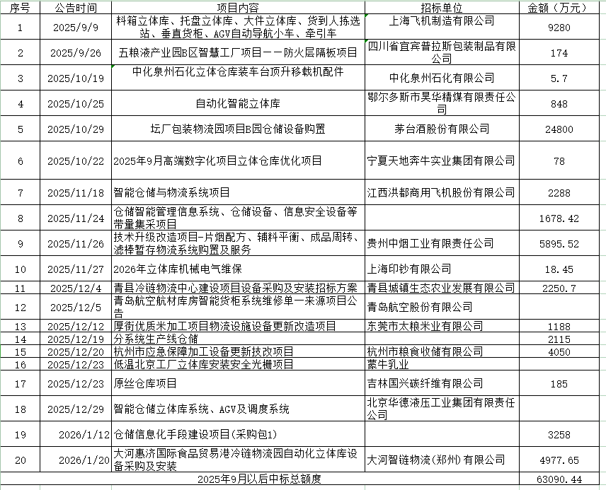 2025年9月至26年1月20日北自科技的中标情况,涵盖了酒厂、烟厂、飞机厂、大型物流企业、政府部门等,总计金额6.3亿(分布项目无金额,不清楚是废标了,还是隐藏看不到)。工业4.0,黑灯工厂。