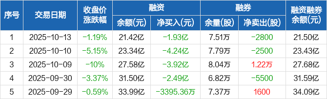 融资方面,当日融资买入2.79亿元,融资偿还4.72亿元,融资净偿还1.93亿元,净偿还额两市排名第14,连续5日净偿还累计12.92亿元。融券方面,融券卖出700股,融券偿还3500股,融券余量7.51万股,融券余额809.58万元。融资融券余额合计21.5亿元。