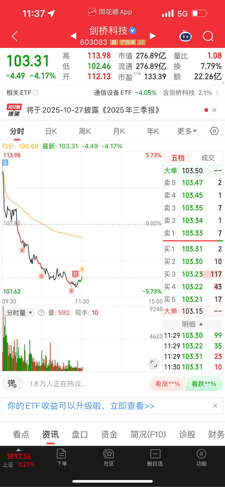 $剑桥科技(SH603083)$ 不要怕,下午拉回回去