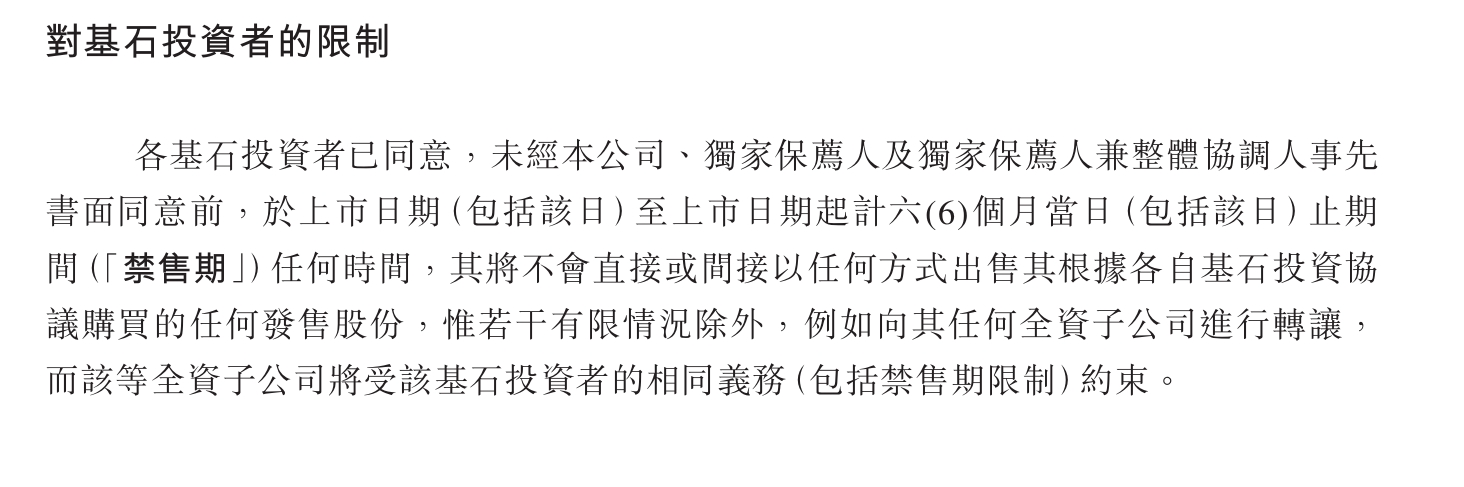 各基石投资者已同意,未经本公司、独家保荐人及独家保荐人兼整体协调人事先书面同意前