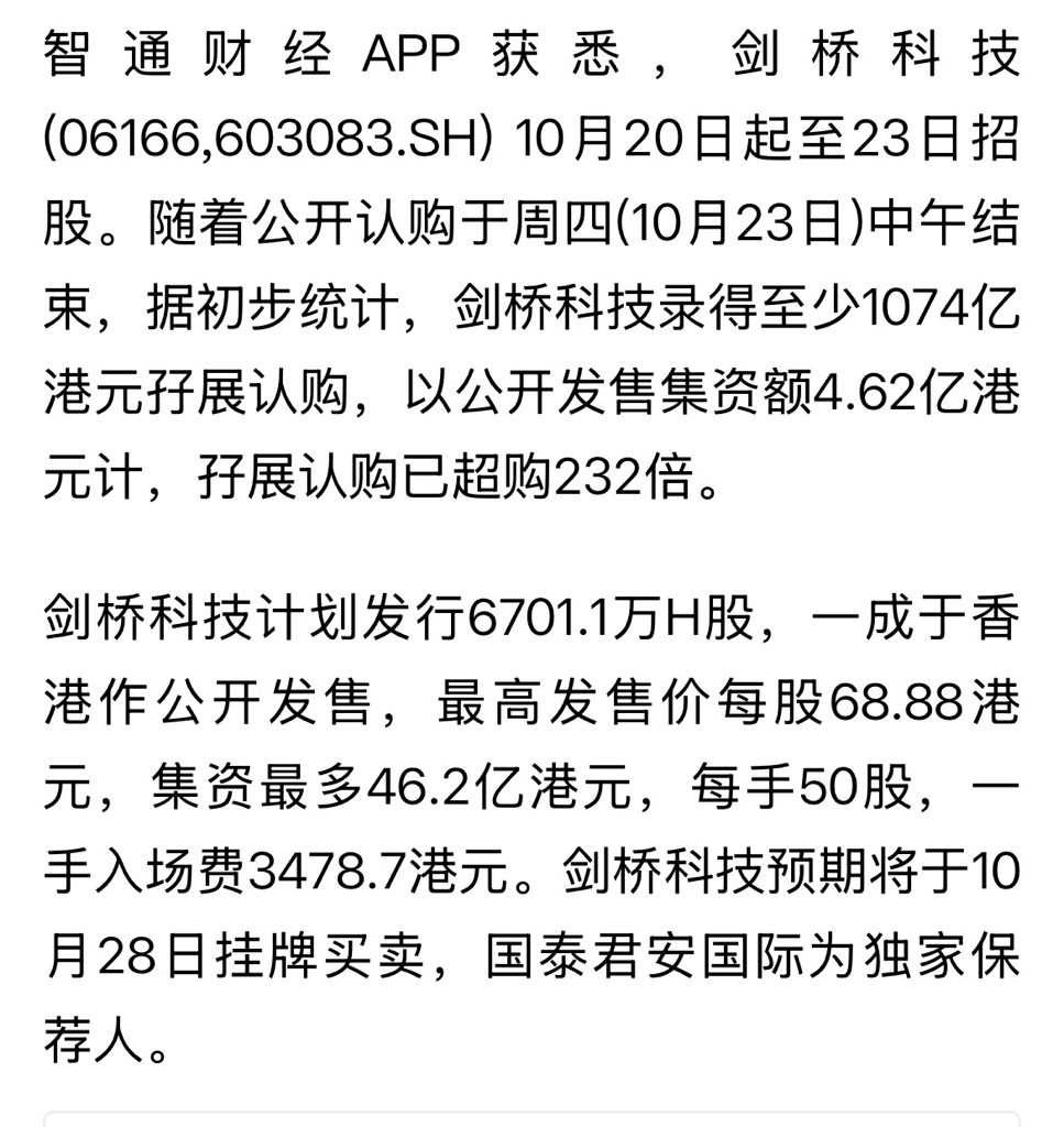 $剑桥科技(SH603083)$ 剑桥科技录得至少1074亿港元孖展认购,以公开发售集资额4.62亿港元计,孖展认购已超购232倍