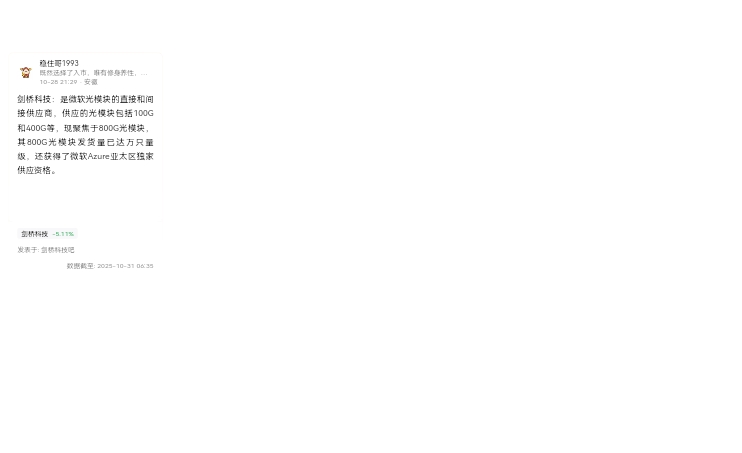 剑桥科技:是微软光模块的直接和间接供应商,供应的光模块包括100G和400G等,现聚焦于800G光模块,其800G光模块发货量已达万只量级,还获得了微软Azure亚太区独家供应资格。
