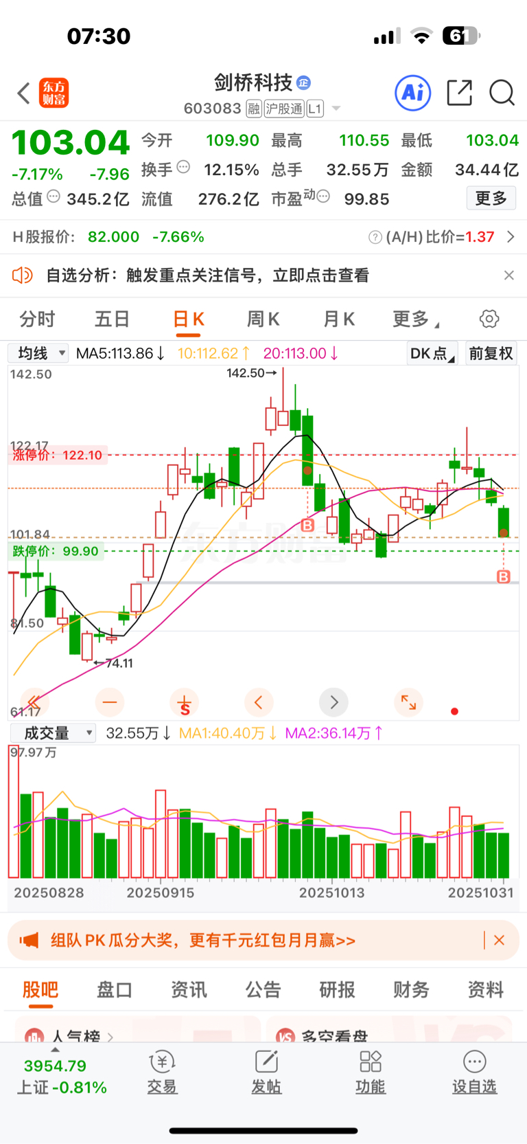 $剑桥科技(SH603083)$ 各位,我也加仓了,有没有问题?昨晚想了一下,感觉加早了,下周一可能还要跌,,唉,,目前亏9个点,不知道能不能回本!!剑桥真不是人,这几天跌太狠了!