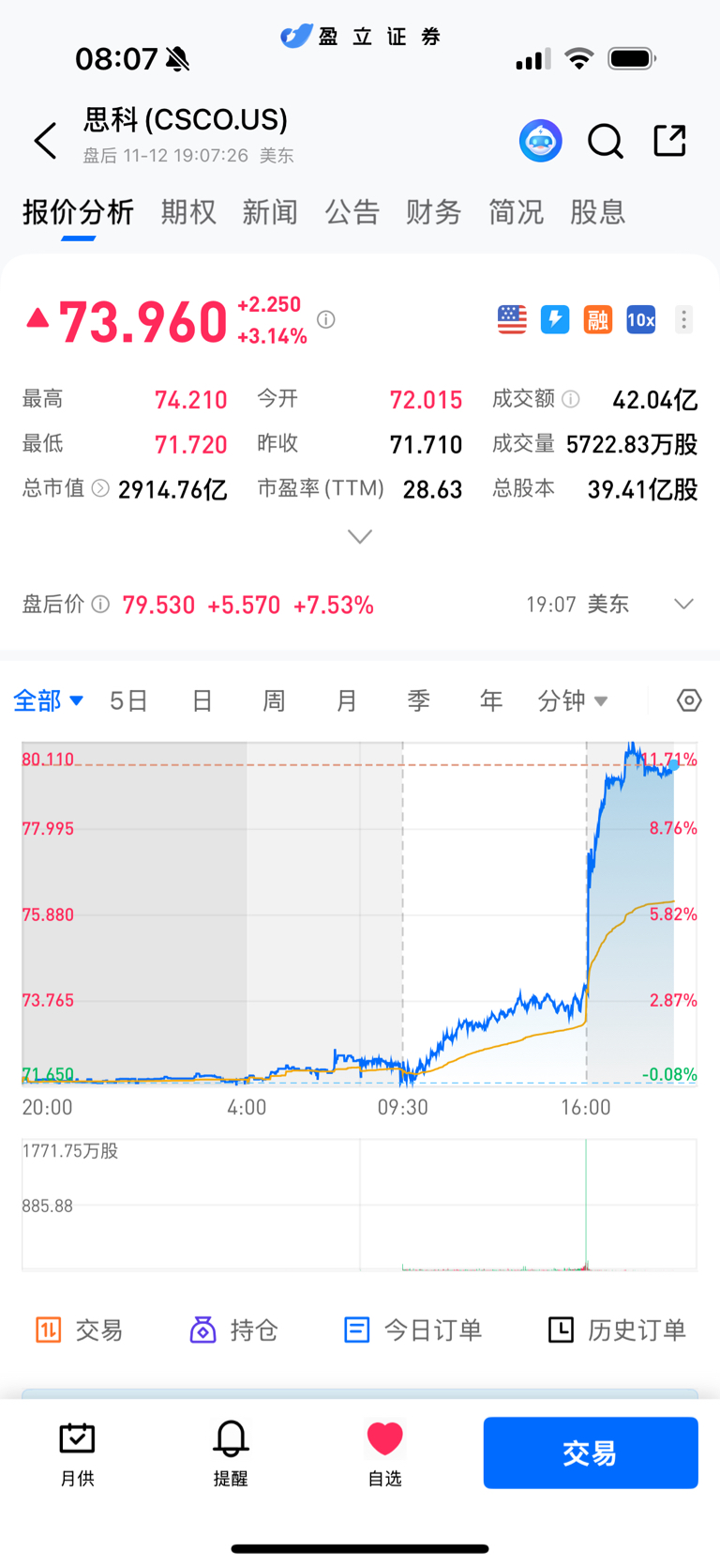 CSCO(思科)盘后继续大涨,今天带CGI剑桥好基友一起飞!!!