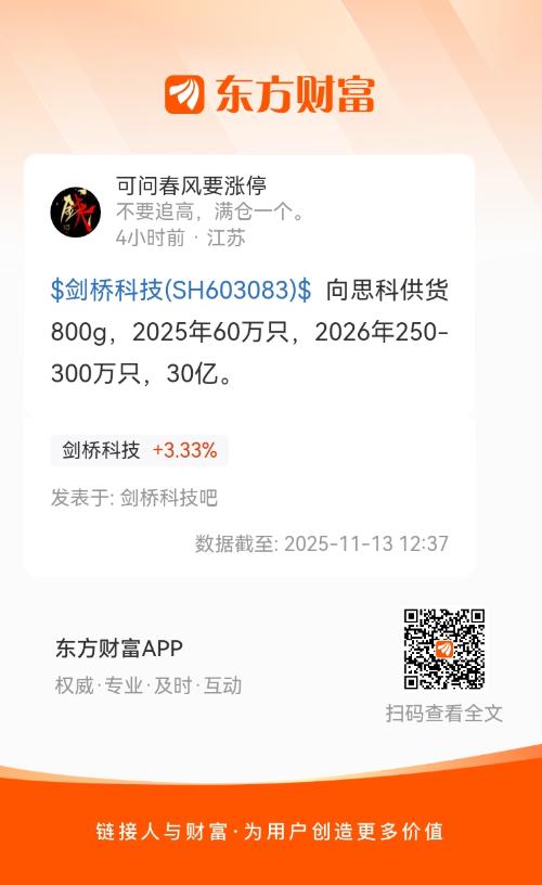 $剑桥科技(SH603083)$  向思科供货800g,2025年60万只,2026年250-300万只,30亿。