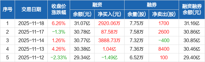 融资方面,当日融资买入7.68亿元,融资偿还7.39亿元,融资净买入2920.06万元,连续4日净买入累计1.73亿元。融券方面,融券卖出8600股,融券偿还6900股,融券余量7.75万股,融券余额881.18万元。融资融券余额合计31.16亿元。