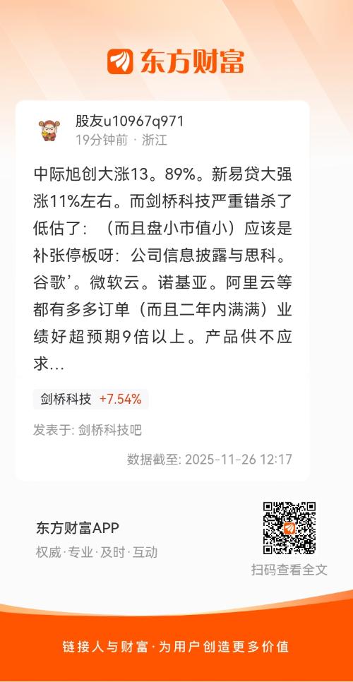 中际旭创大涨13。89%。新易贷大强涨11%左右。而剑桥科技严重错杀了低估了:(而且盘小市值小)应该是补张停板呀:公司信息披露与思科。谷歌’。微软云。诺基亚。阿里云等都有多多订单(而且二年内满满)业绩好超预期9倍以上。产品供不应求…
