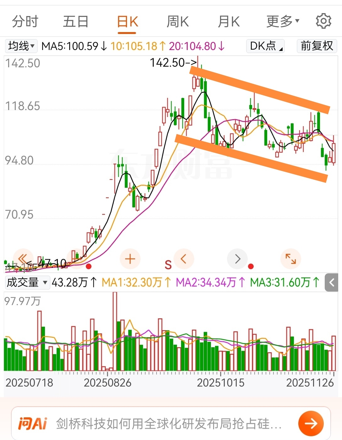 $剑桥科技(SH603083)$ 我是个理智的散户,不盲目看多或者看空,但如图所示,明显下降通道,个人觉得如果要涨也不是现在,大家都是怎么看的