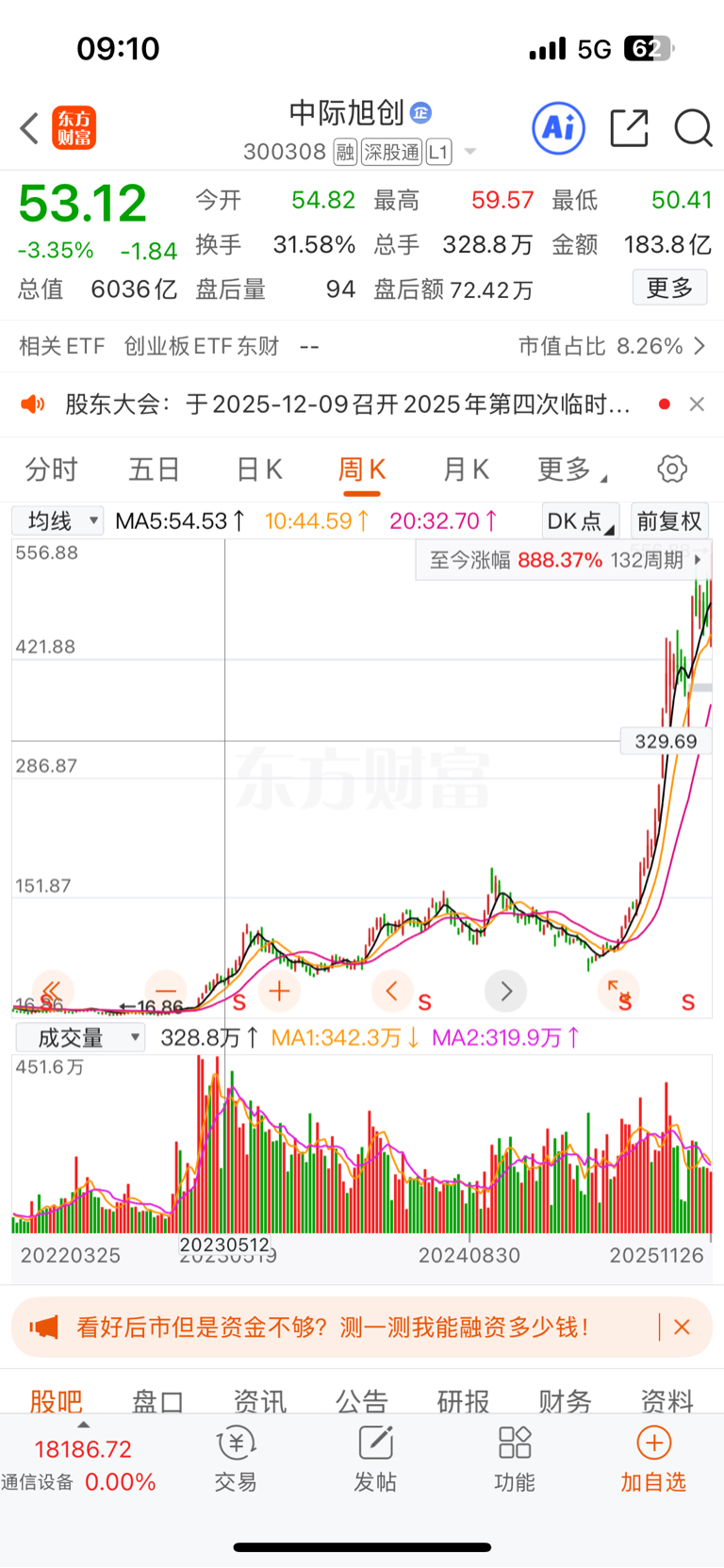 就是在想10倍,难度太大。中际旭创,我们50块附近进入,中途出出进进,马德拿着不动,550块了,10倍了,