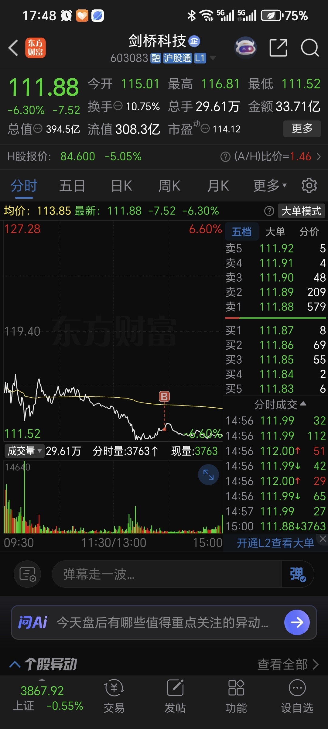 下午趁着CPO大跌,建仓买回来一点剑桥科技,等止跌回稳了。再考虑多买点!