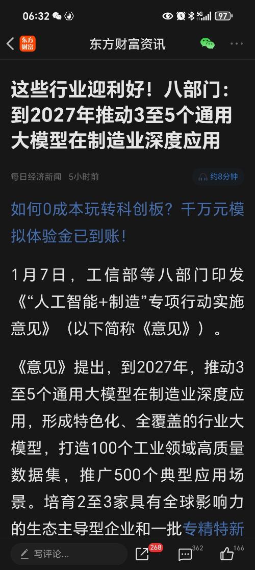 八部门“人工智能+制造”专项行动对剑桥科技是直接的业务利好,核心拉动其算力与工业通信硬件需求: 1. 通用/行业大模型落地带动算力硬件需求 政策推动大模型在制造业应用,而大模型的训练、部署依赖高算力基础设施(如光模块、交换机)。剑桥科技的核心产品(高速光模块、数据中心交换机)是算力硬件的关键组成部分,制造业大模型的规模化落地会直接增加其相关产品的采购订单。 2. 工业场景应用强化其工业通信产品需求 政策要推广500个工业AI应用场景,这些场景需要“低时延、高可靠”的工业网络支撑,剑桥科技的工业光模块、工业交换机等产品可适配这类场景,企业在智能化改造中会采购其硬件搭建工业网络,进一步打开业务空间。 3. 长期成长逻辑更清晰 政策明确了AI+制造的落地目标,剑桥科技的算力+工业通信硬件是这一趋势的底层支撑,其业务的长期成长性会更受市场认可,有助于估值提升。 简言之,这一政策精准匹配剑桥科技的核心业务方向,会直接拉动其产品需求,是实质性利好。