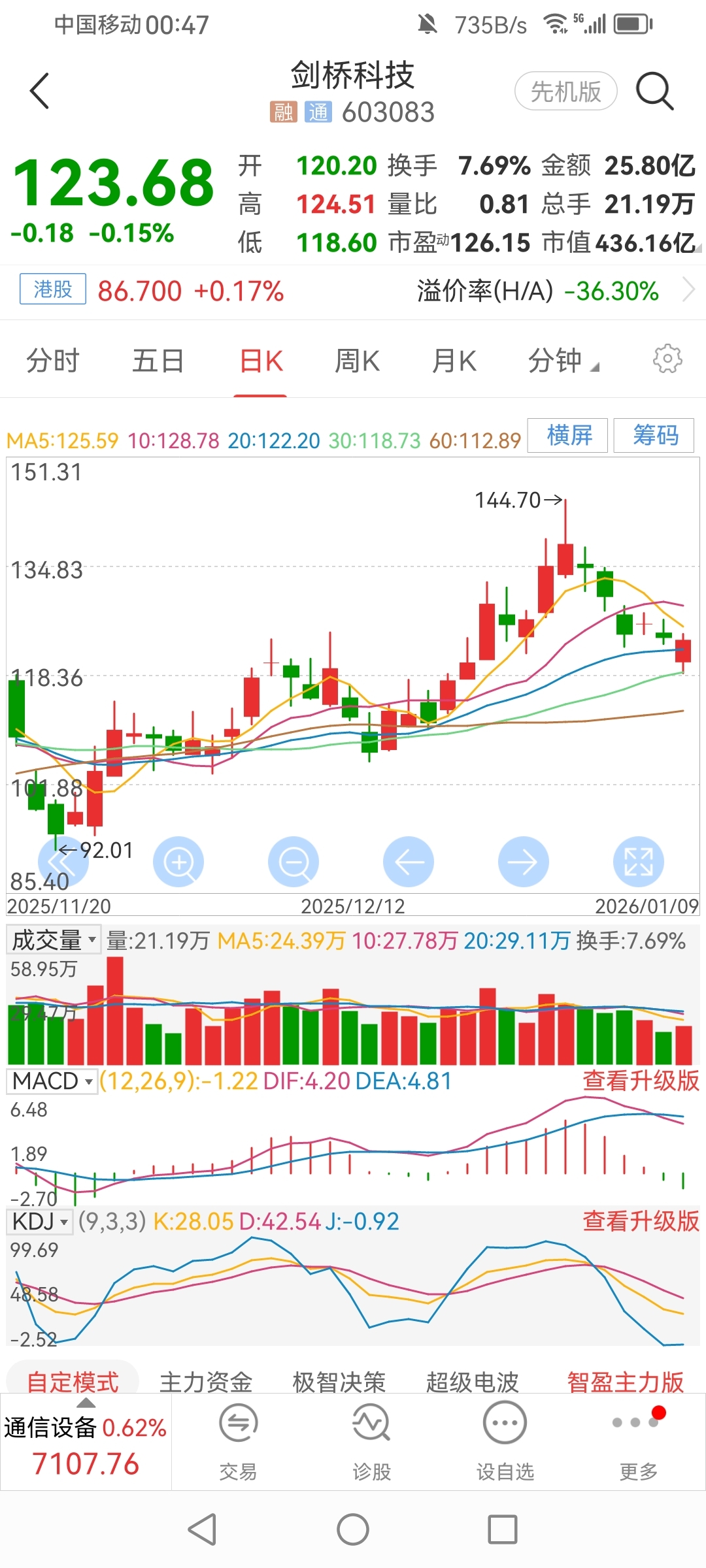 $剑桥科技(SH603083)$ 走势规律不例外,历史新高没能继续走高,回调就在所难免,眼下的走势雷同三剑客,日高点被压在5日均线之下,自然也就成了每日的高抛位置,操作上雷同今日,先下就先接,先上既先出,见红或头日收盘价附近,就开始往外T,运气好遇到差价大时,稳稳的可以做到当日收绿都能不输,还降了成本。事在人为。都知难者不会、会者不难,若不动手去尝试,那就是永远不会,自然永远都是难的。