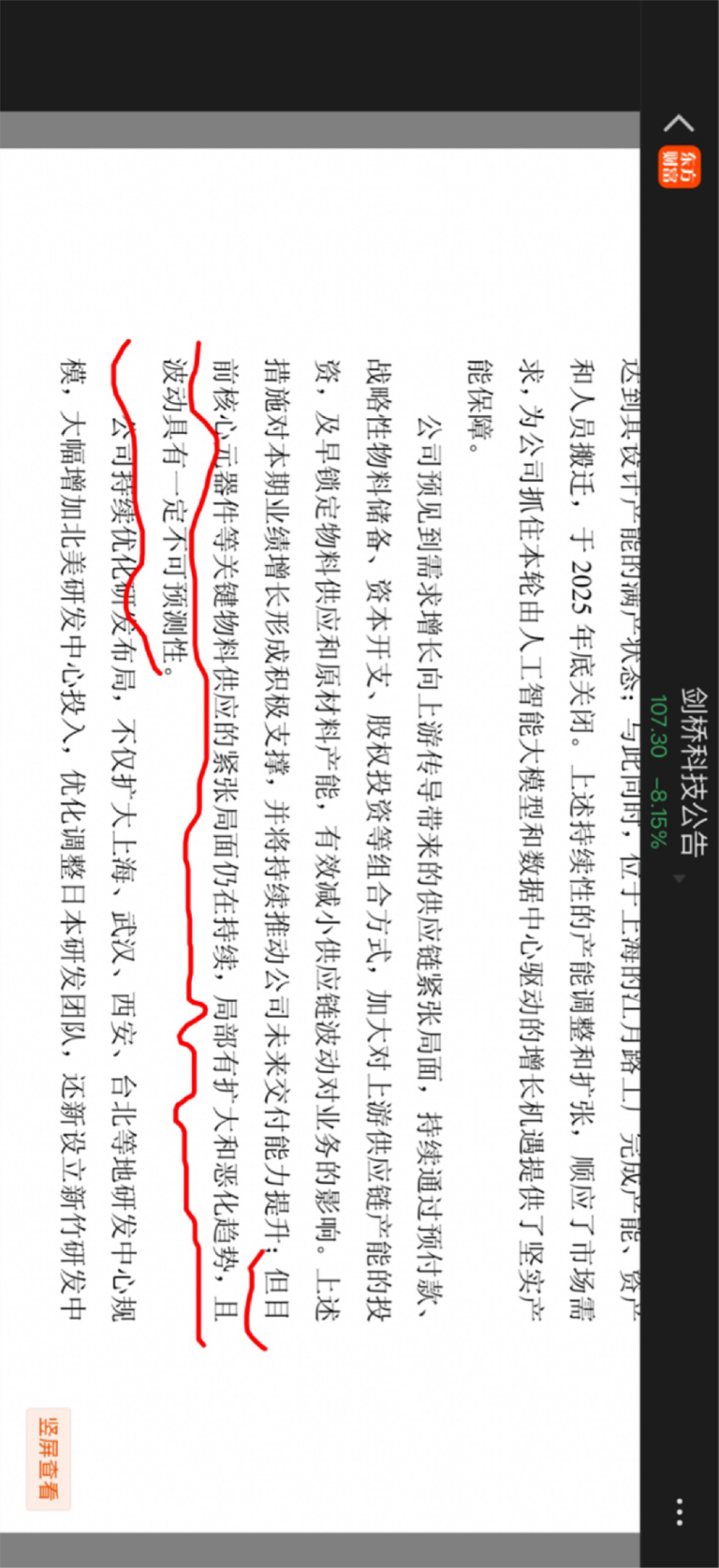 这段公告内容反映的供应链与研发布局,对剑桥科技的影响是短期偏谨慎、长期偏积极的混合效果: 1. 短期偏谨慎:供应链风险仍在 公告提到“核心元器件供应紧张仍持续,局部有扩大和恶化趋势”,且波动“不可预测”——这意味着剑桥科技的光模块等核心产品,短期仍面临原材料供应不稳定的问题,可能影响产能交付节奏,进而对短期业绩造成压力,这也是当前市场担忧的点之一。 2. 长期偏积极:布局支撑未来竞争力 - 供应链措施:通过预付款、锁料等方式保障供应,长期能增强交付稳定性,减少供应链波动对业务的冲击;- 研发扩张:新增北美、新竹等研发中心,优化全球研发布局——这是为了抓住AI大模型的增长机遇,长期能提升技术竞争力(比如光模块的高端产品研发)。 总结:短期看,供应链风险的持续会压制市场情绪;但长期看,供应链保障+研发扩张的布局,能支撑公司后续的交付能力和技术优势,是长期发展的积极信号。