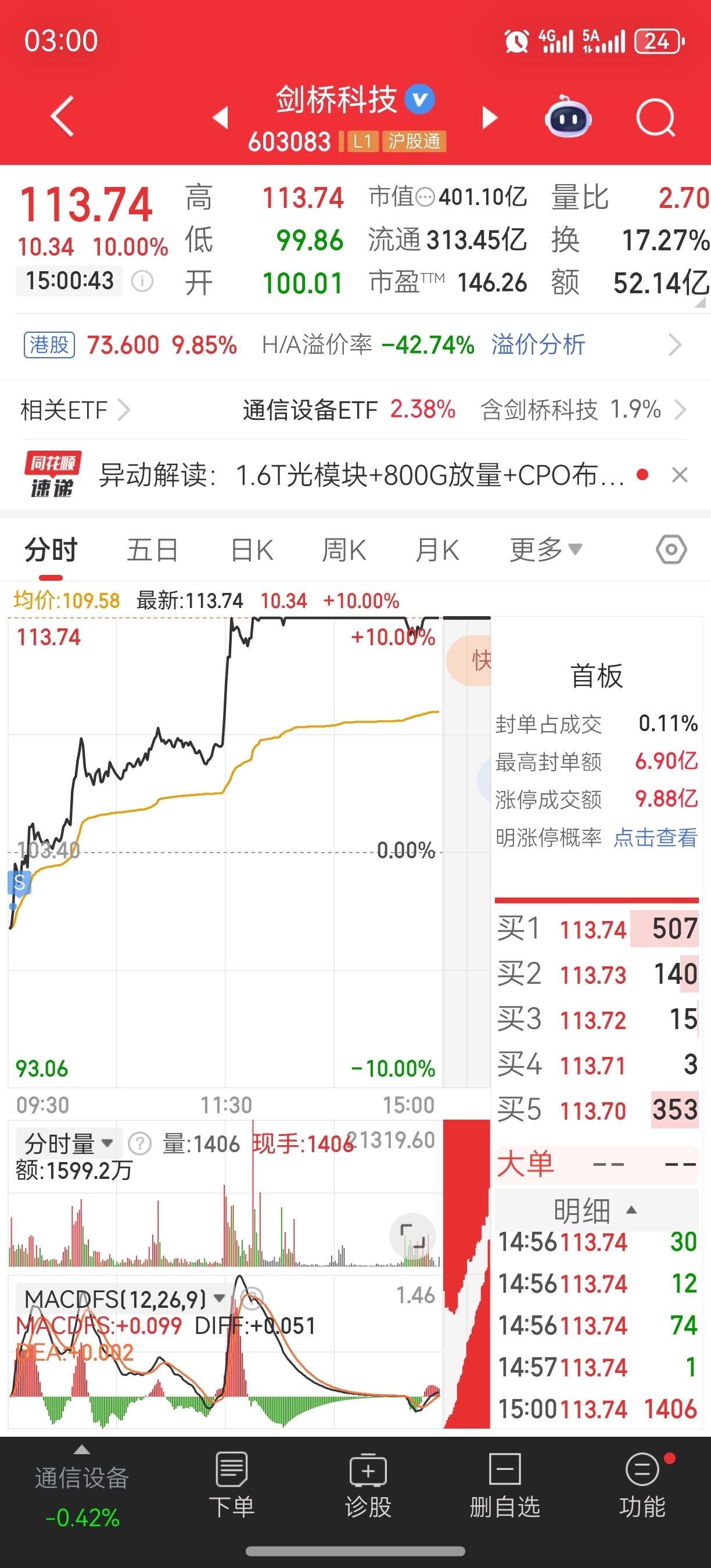 $剑桥科技(SH603083)$ 开局卖了,居然涨停了
