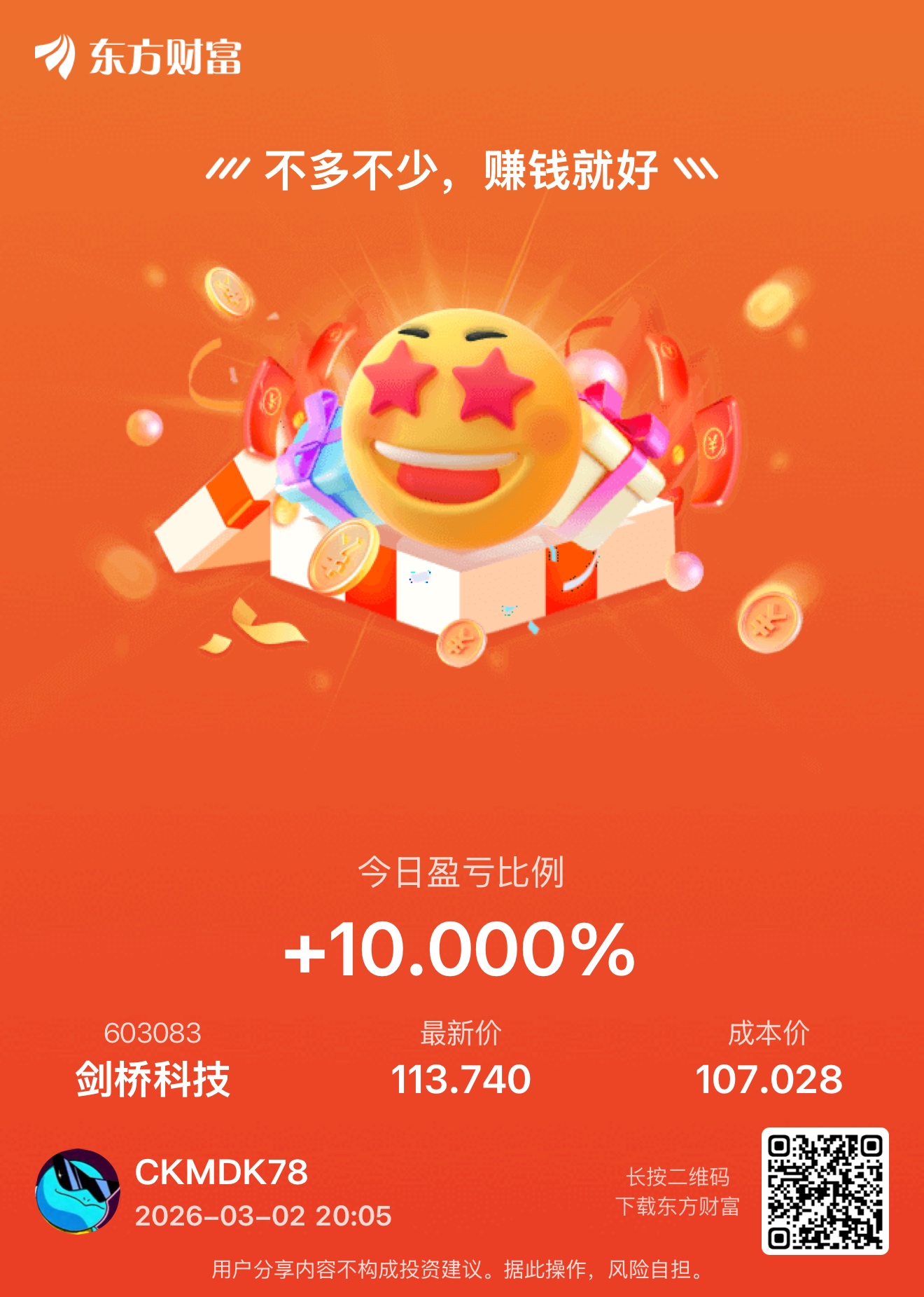 温馨提示: 1.根据《证券法》规定,禁止编造、传播虚假信息或者误导性信息,扰乱证券市场;2.用户在本社区发表的所有资料、言论等仅代表个人观点,与本网站立场无关,不对您构成任何投资建议。用户应基于自己的独立判断,自行决定证券投资并承担相应风险。《东方财富社区管理规定》