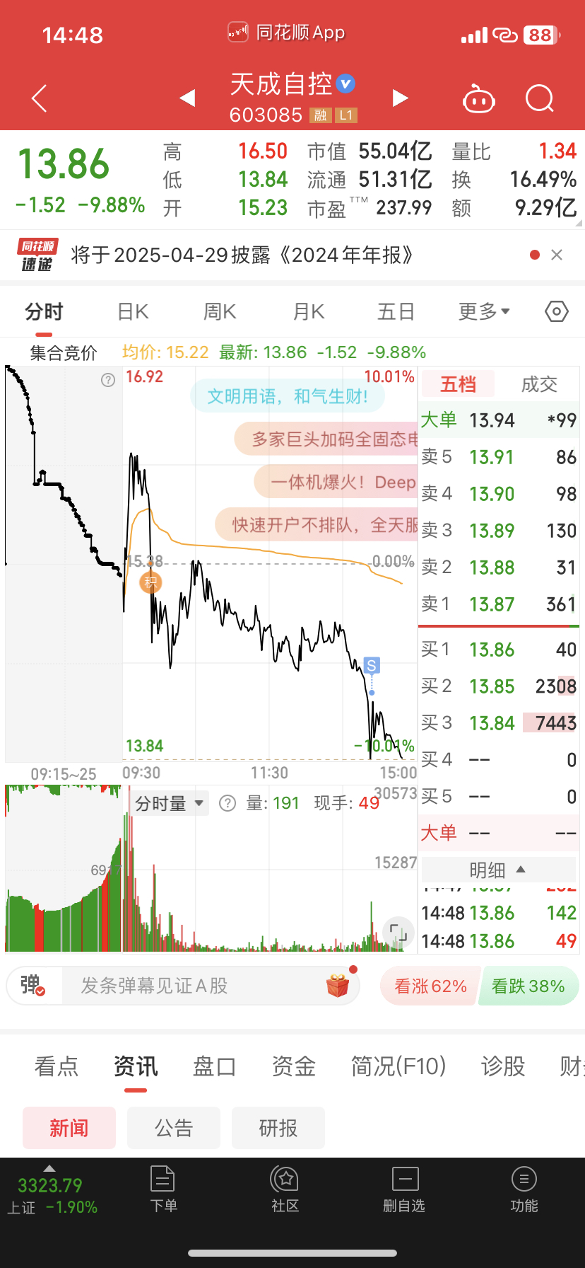 $天成自控(SH603085)$ 怪自己割肉太磨叽了,昨天赚的今天亏,以后不这样了,相差十几个点
