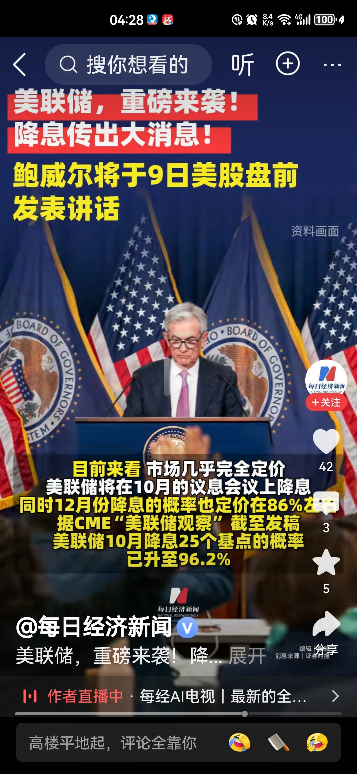$甘李药业(SH603087)$ 美联储10月降息25个基点的概率96%