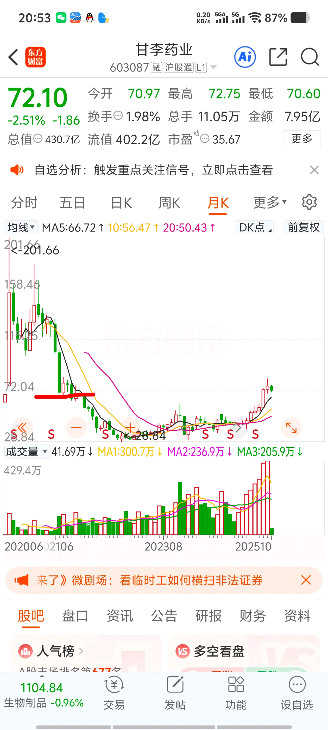 $甘李药业(SH603087)$ 看看左边,这个位置预估要震荡几个月,要到明年才会有大幅拉升了