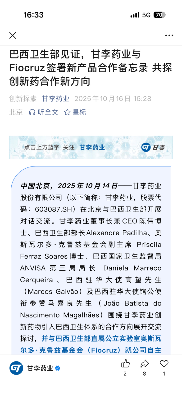 $甘李药业(SH603087)$ 合作层级很高,已经不是单纯的产品出口了。