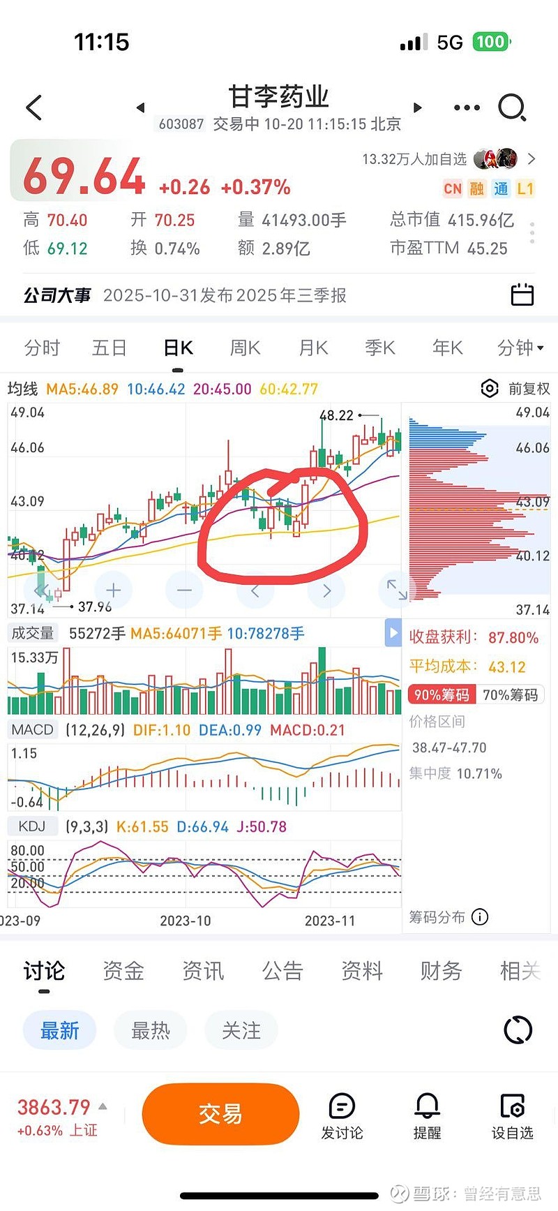 $甘李药业(SH603087)$ $甘李药业(SH603087)$ 2023年的三季报双底行情,也是在60天线获得支撑,随后开启一波接近50%的涨幅。这次所有的面都比两年前好,主力资金们看着办把,也不是非得10个亿的净利润写在报表上你们才进场扫货的,对于甘李这么高确定性的标的,完全可以打个申请,特事特办,不然只能在明年年报利润十个多亿写在报表、股价三位数的时候追着买了