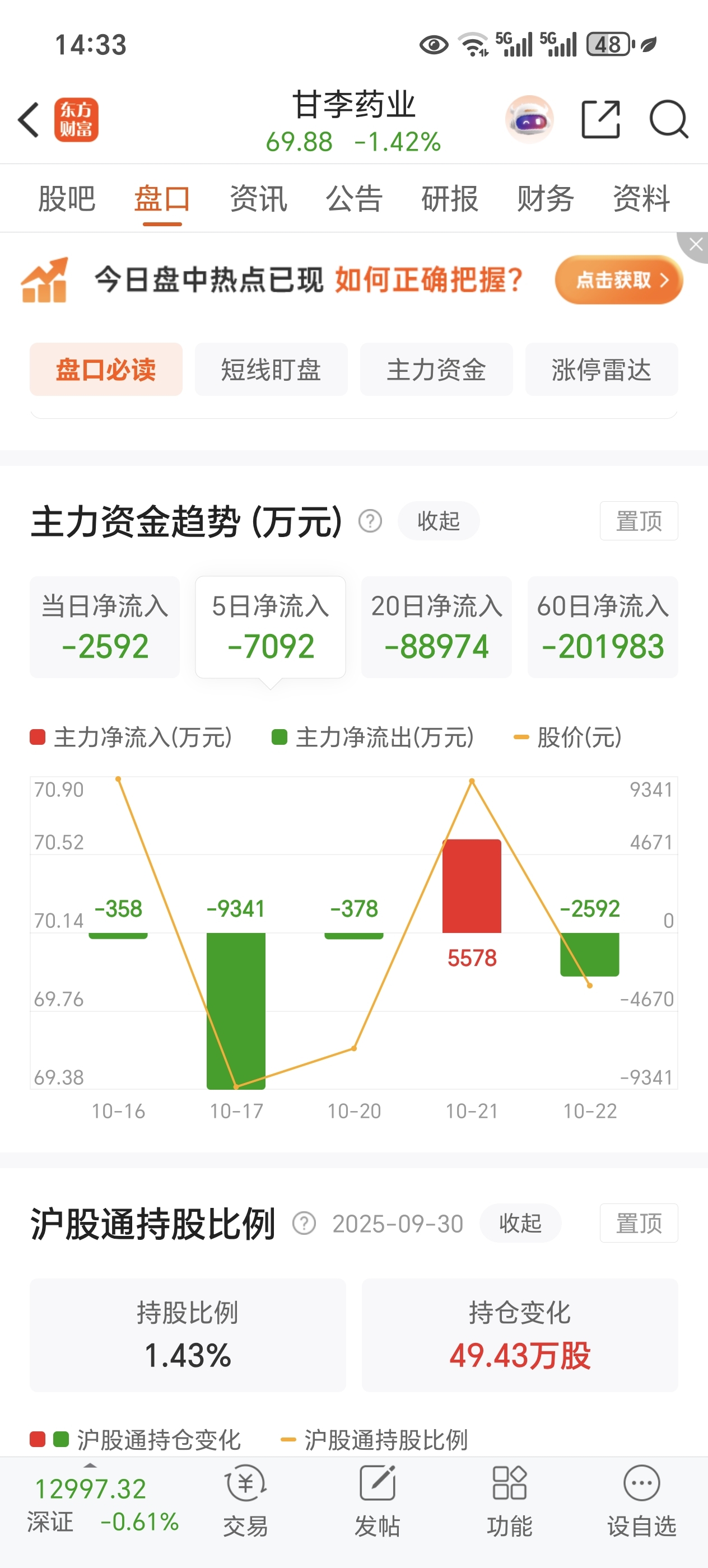 $甘李药业(SH603087)$ 主力资金,净流出两个月,二十个亿左右,对于一个几百亿市值的个股,后面大概率连续下跌。目前重仓甘李药业,心里一下子没底了。