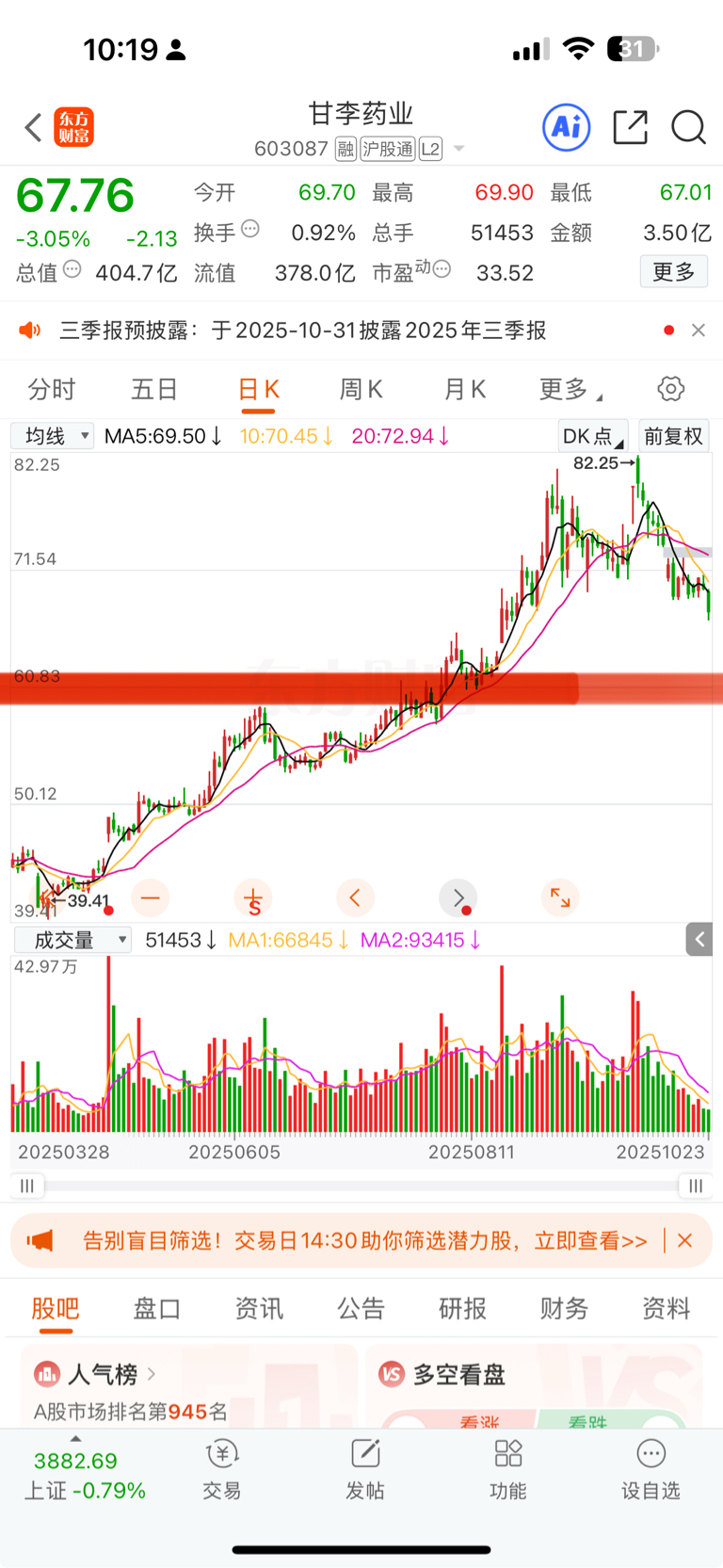 $甘李药业(SH603087)$ 就问敢不敢跌这里,跌就里就有资金愿意来吃货