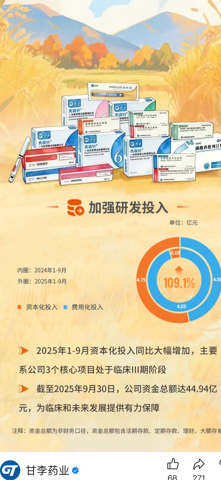 $甘李药业(SH603087)$ 不为浮云遮望眼,直挂云帆济沧海! 大家需要重点关注:今年前三季度甘李药业资本化投入大增4.56亿。这4.56亿钱是砸出去了,但是没有影响当期利润,而是留待以后的财报里逐步摊销! 换个说法,大家或许更能看懂:如果增加的4.56亿研发投入,不是资本化,而是费用化,那么,今年前三季度(报告期)的利润就应该是8.183-4.56=3.623亿,与去年同期相比将是大幅下降的。 当然,甘李药业的这两款重磅药品,价值如何,根据马克思的政治经济学理论,劳动力价值,需要变成商品卖出去,其劳动力价值才能实现!留待以后验证吧,老朽也将拭目以待。 以上是老朽的一点愚见,股吧之中,不乏财务高手,望不吝赐教,批评指正。