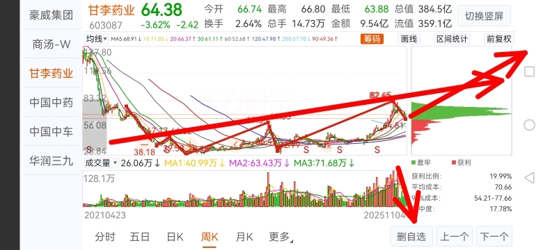 $甘李药业(SH603087)$ 先画线,周线级别,三买区间,接着演戏,接着舞!而空方的成交量严重萎缩,说明什么?说明主力的做空力量较弱了!下一高点应该是110左右。还有一个高瓴资本的不离不弃,说明其投资价值不差!高瓴资本它直接忽略了二卖区间。不会画线的刀手,不是好刀手。但是会画一点,不精,不会用电脑,大家可以笑话我!我不是天才!