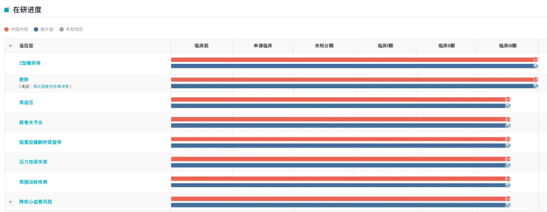 礼来布局的GCG/GIP/GLP-1受体三重激动剂Retatrutide(瑞他鲁肽)也是潜在大药,目前正在开展多项III期研究,适应症包括肥胖、2型糖尿病、心血管事件二级预防、OSA、肥胖或超重伴慢性腰痛等。