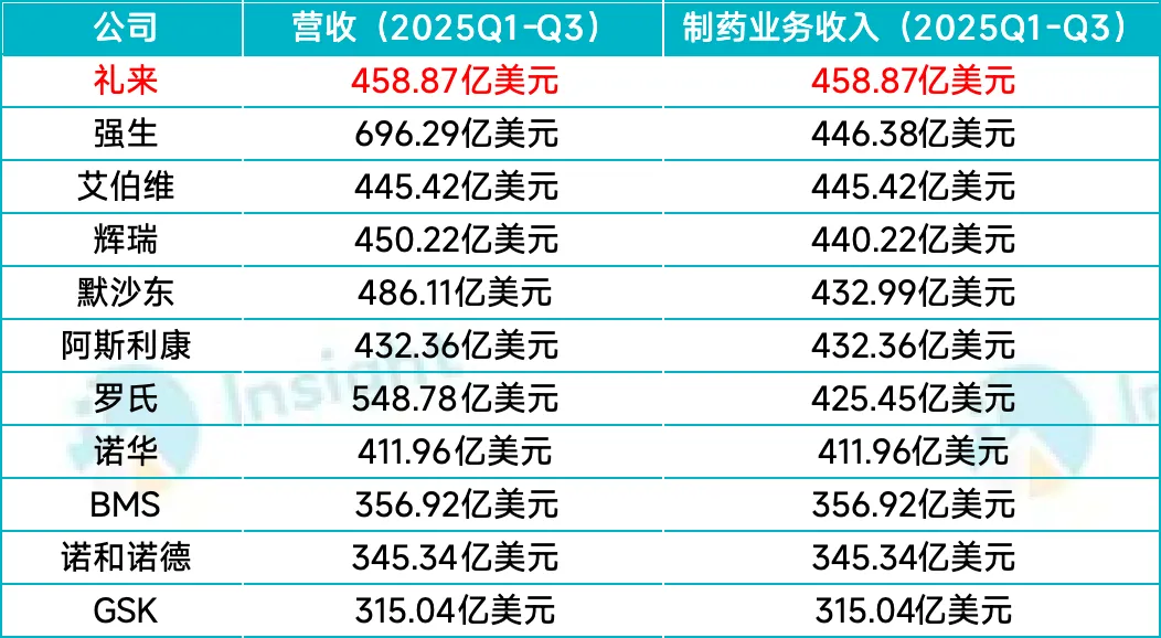 这还没完,2025年前三季度,礼来继续交出靓丽成绩单,总营收规模已经超过2024年全年,在全球制药巨头营收中排名上升至第四;按制药业务收入看,礼来已经升至第一名。