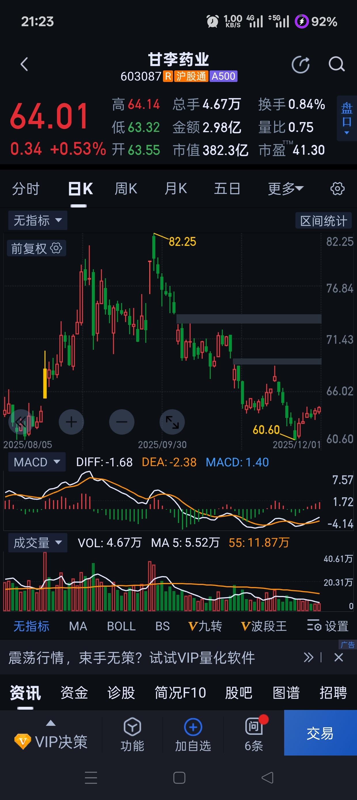 $甘李药业(SH603087)$ macd红绿柱背驰,说明下跌动力减弱,目前来看,70%大概率是底部