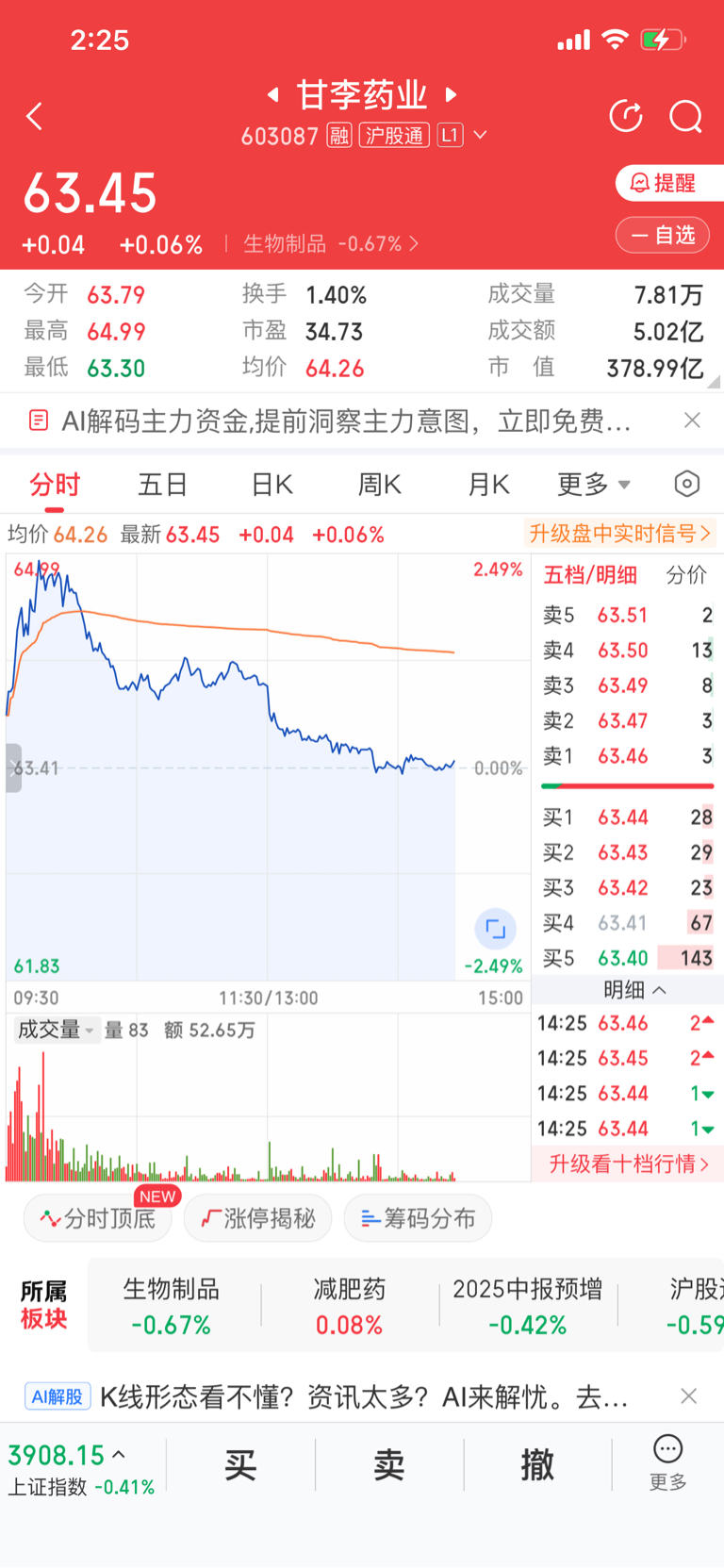 $甘李药业(SH603087)$ 这票有个奇怪的地方,每次大盘红柱子开始放出拉升,就是涨不上去,分时线能走成锯齿形,死死压住让股价横盘,大盘绿柱放出跌的时候可以有钓鱼线向下砸盘,然后反弹的时候又是拼命压制不让涨,但是分时候卖一到卖5,看不出有什么大卖单,反而显得很冷清,是啥原因