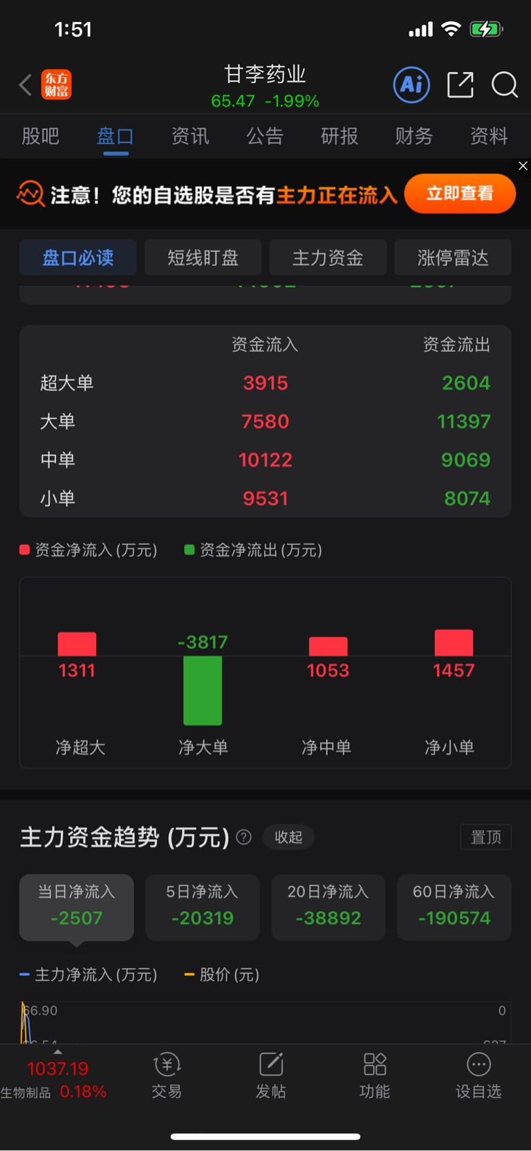 $甘李药业(SH603087)$ 今天的走势非常诡异,昨天收盘后日线技术上极为完美,单针探底,两阳夹一阴形成多方炮,上穿均线,强烈看涨,结果今天开盘就是低开,不涨反跌。而且指数拉升时总有中单卖出压制股价让价格横盘,大盘只要一回落就中单砸盘,而且上午买3位置始终有大买单挂着,价格下来了就撤单,然后继续买3位置挂着跟你们看,下午一点开盘后突然一笔大卖单砸掉所有买单猝不及防,然后又是大盘上涨,股价压制横盘,大盘下跌就中单砸盘,盘面大小单复盘,超大单居然还是流入的,但是股价不涨反跌