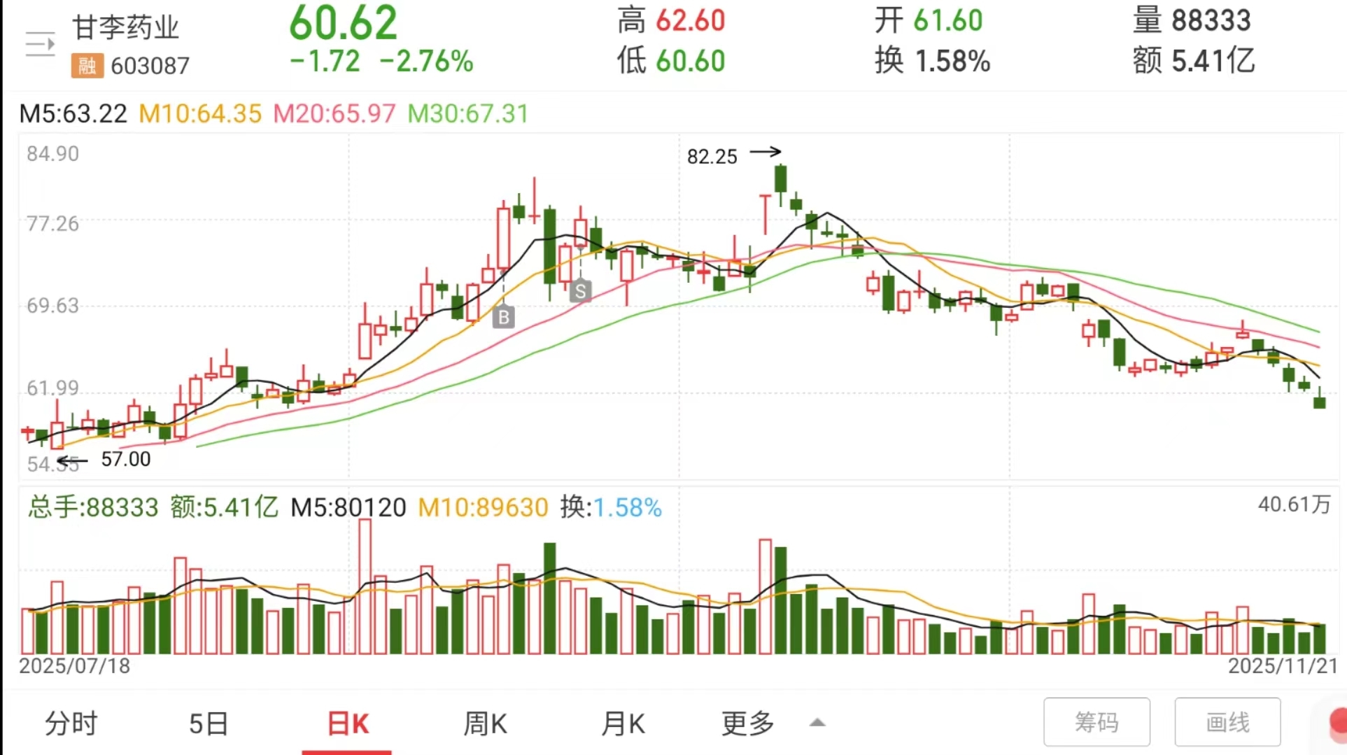 $甘李药业(SH603087)$ 本人之前的操作,虽然没能买在最低点,也没能卖在最高点。中间也被套了两天。过程是错的,但结果是正确的。赚了2000多元。本人正在等待他新的低点出现,在12月22日之后。