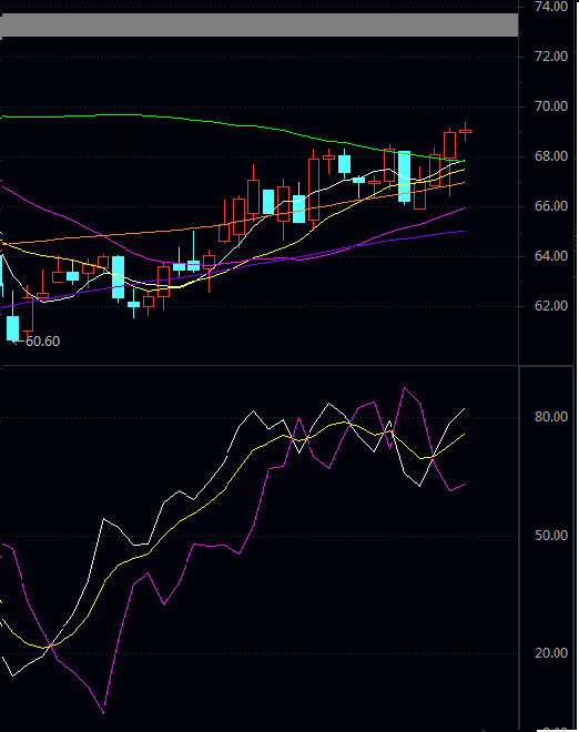 阻力二 69.85 阻力一 69.48 均 价 69.04 支撑一 68.67 支撑二 68.23