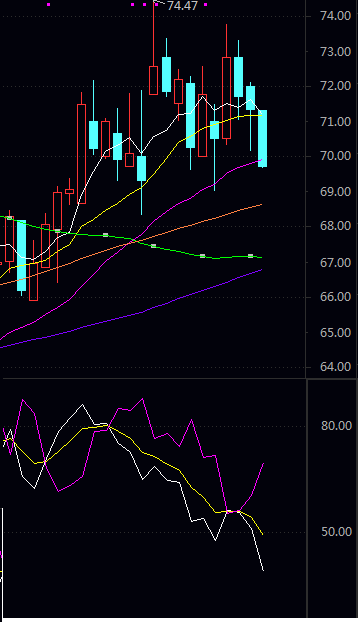 阻力二 71.16 阻力一 70.53 均 价 70.10 支撑一 68.87 支撑二 68.44