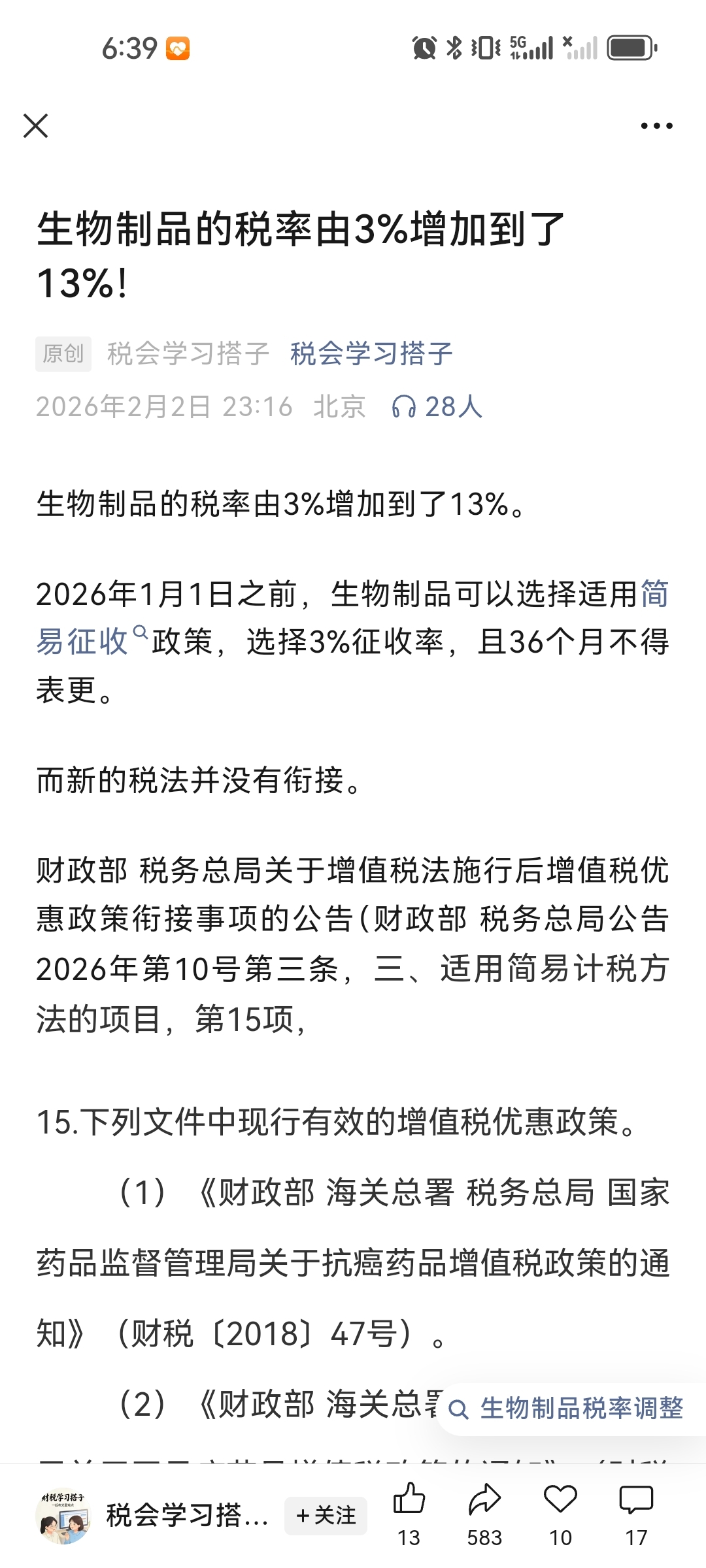 $甘李药业(SH603087)$ 今天大跌,原因来了。生物制品税率从3%调整为13%。