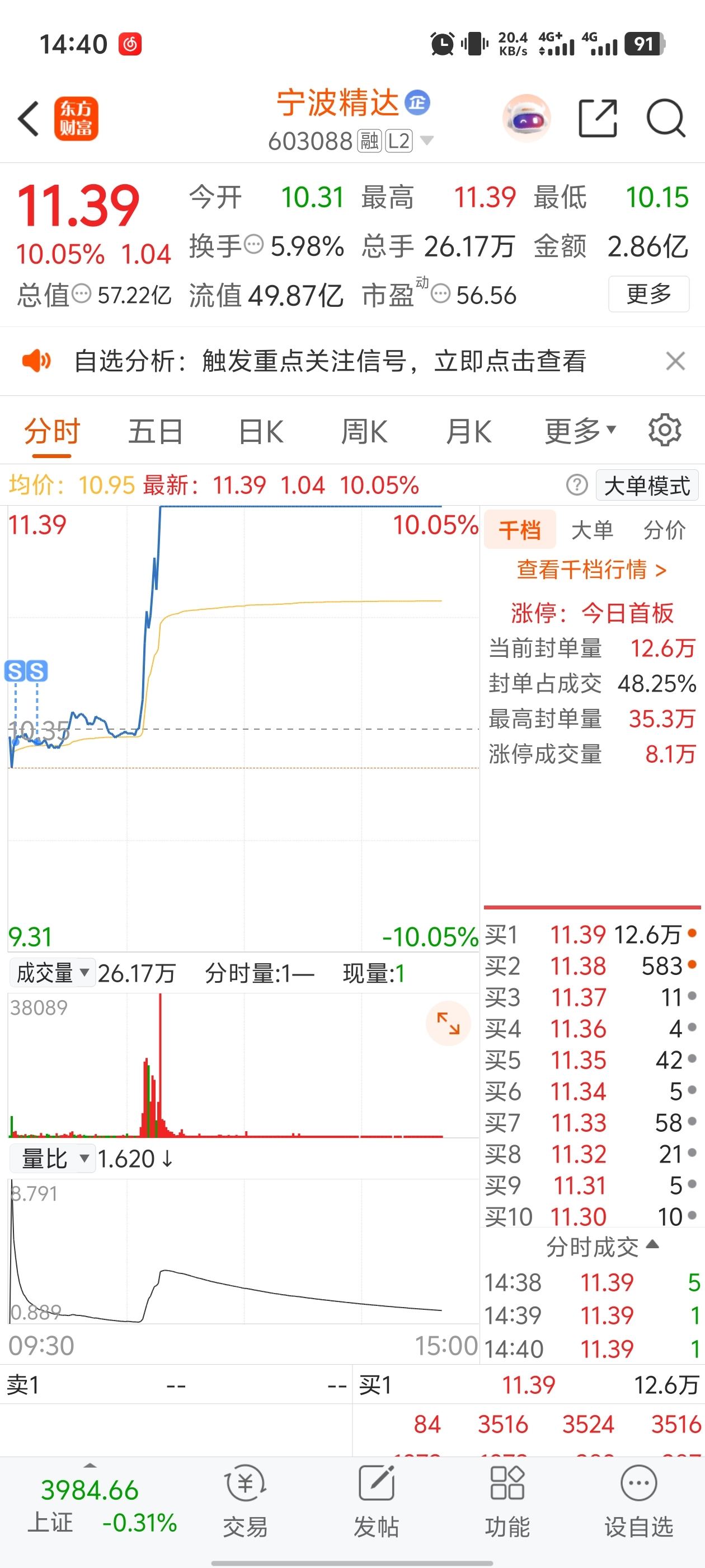 $宁波精达(SH603088)$ 知道会涨还是开盘卖的精光,只留了25手,就因为看到了更好的机会,全部转到了楚江新材,想着精达底仓留着什么时候再接回来,也不知道选择对错,不过精达上去要过13应该也要停下来交换筹码,上车机会总会有的