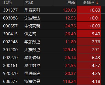 上证报中国证券网讯 10月29日早盘,工业母机概念盘中异动拉升,截至11时01分,宁波精达2连板,鼎泰高科涨超10%,伊之密涨超9%,华东数控、大族数控涨逾7%,华中数控等跟涨。中钨高新此前封板。