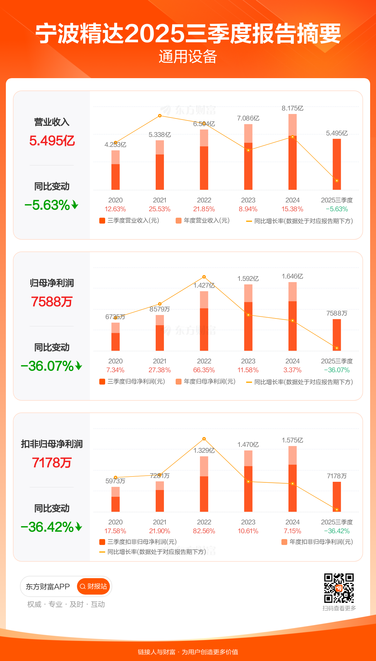 宁波精达10月24日发布2025年三季报显示,公司前三季实现营业收入5.49亿元,同比下滑5.63%;归母净利润7587.89万元,同比下滑36.07%;扣非归母净利润7177.86万元,同比下滑36.42%。