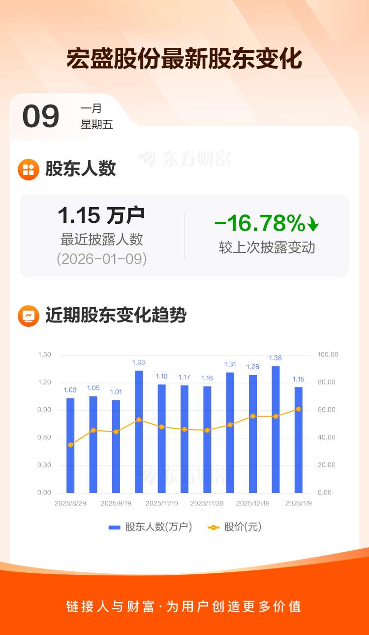 宏盛股份:截至1月9日最新股东户数1.15万户,较上期减少16.78%