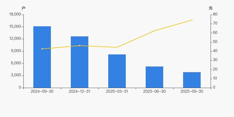 2024年9月30日至今,公司股东户数显著大幅下降,区间跌幅达74.61%。2024年9月30日至2025年9月30日区间股价上涨74.33%。