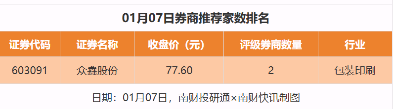 从券商推荐家数来看,1月7日有16家上市公司得到券商推荐,其中众鑫股份获得2家推荐,联美控股、金财互联等获得1家推荐。