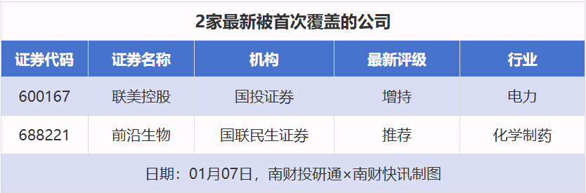 首次覆盖方面,1月7日券商共给出了2次首次覆盖,其中联美控股获得国投证券给予“增持”评级,前沿生物获得国联民生证券给予“推荐”评级。