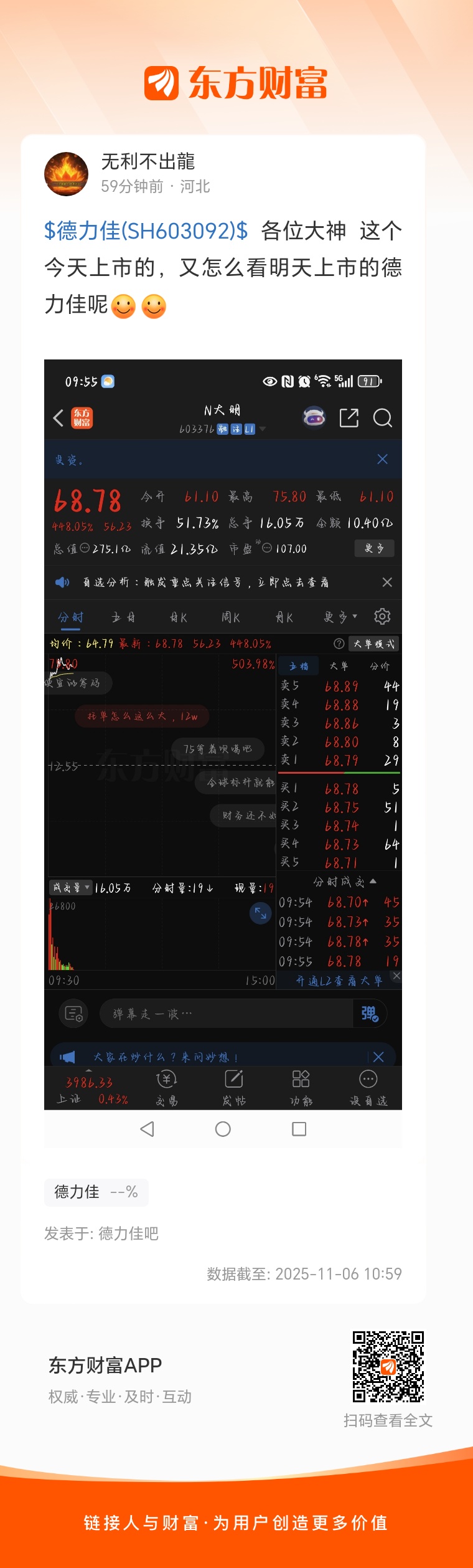 $德力佳(SH603092)$  各位大神  这个今天上市的,又怎么看明天上市的德力佳呢