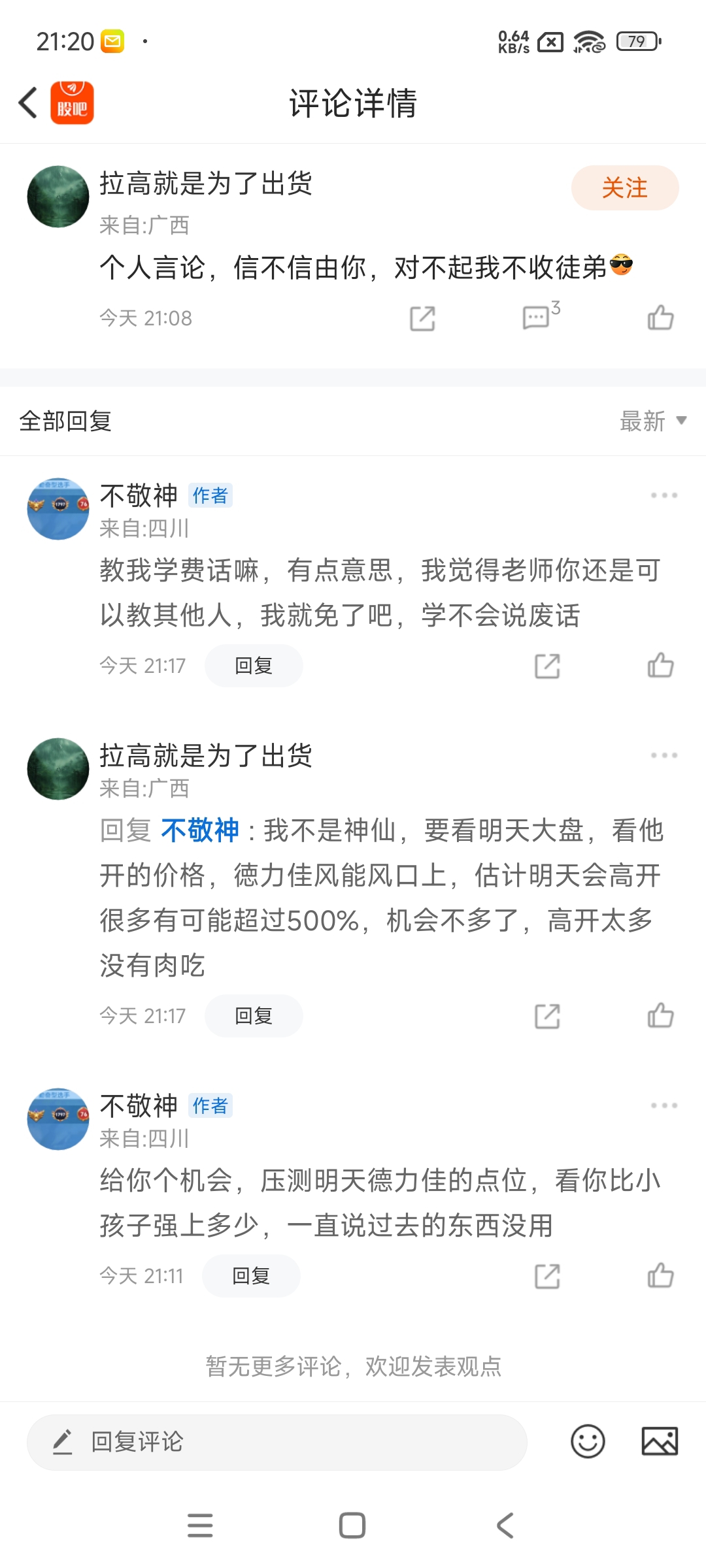 $德力佳(SH603092)$ 来,给你们高兴高兴,有个炒股炒疯了的,说明天张5倍,现在还在大明电子评论区发疯