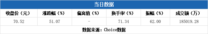 上交所2025年11月7日交易公开信息显示,N德力佳因属于无价格涨跌幅限制的证券而登上龙虎榜。N德力佳当日报收70.52元,涨跌幅为51.07%,换手率71.34%,振幅62.00%,成交额18.50亿元。