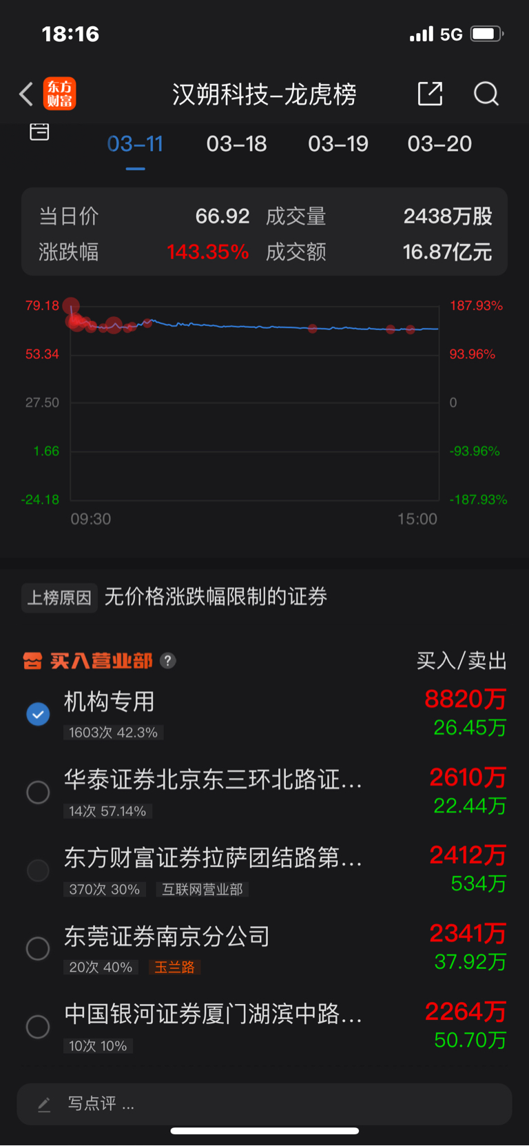 $N德力佳(SH603092)$ 大家搜汉朔科技上市当天龙虎榜,也是机构一家独大,第二天大涨27%