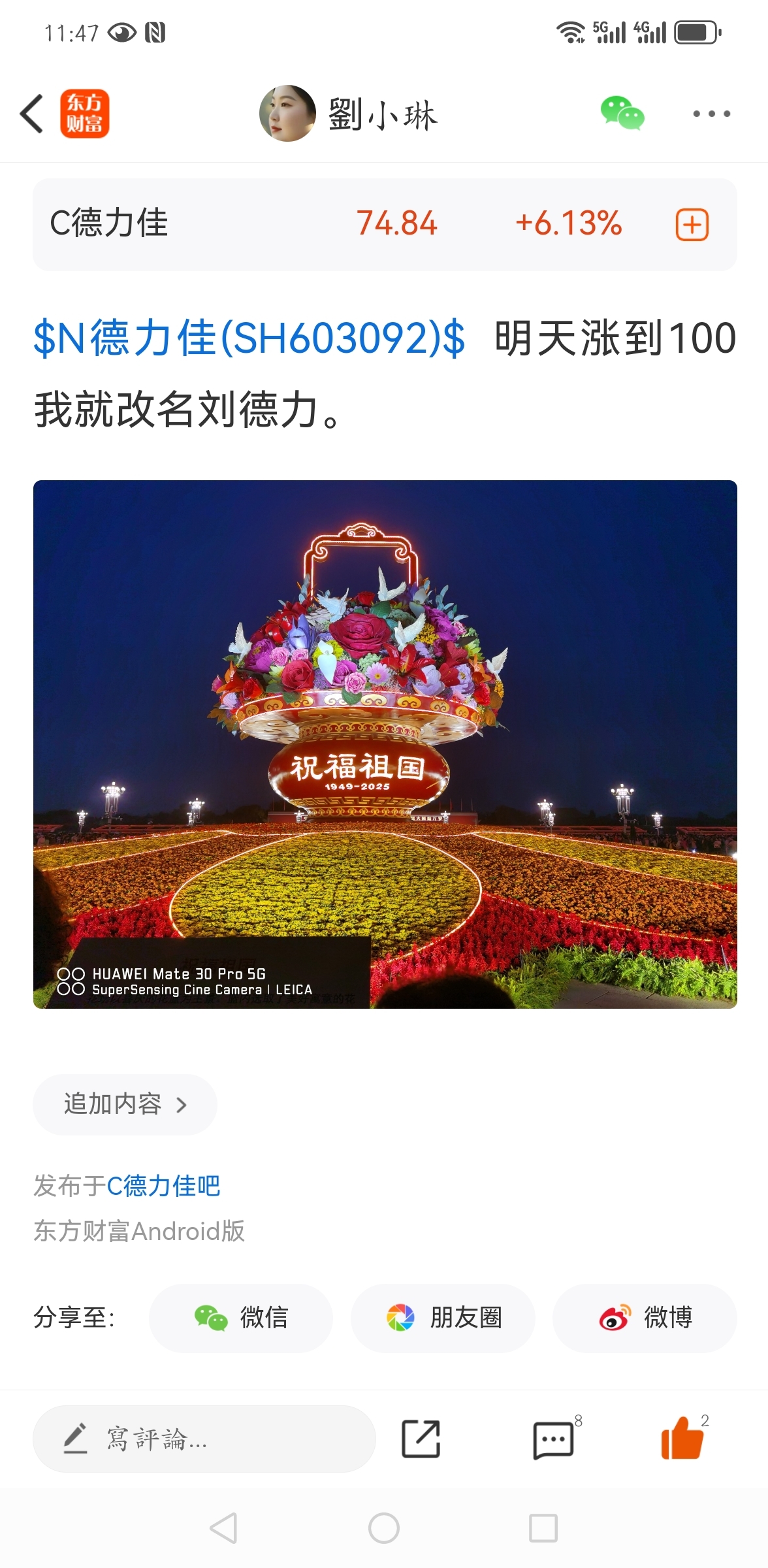 $C德力佳(SH603092)$ 本小姐给德力哥股价调高至120。